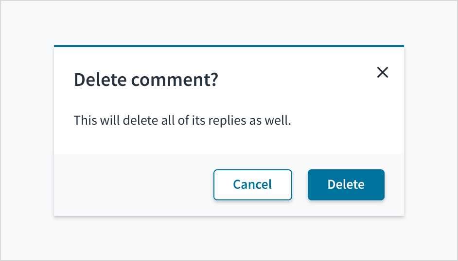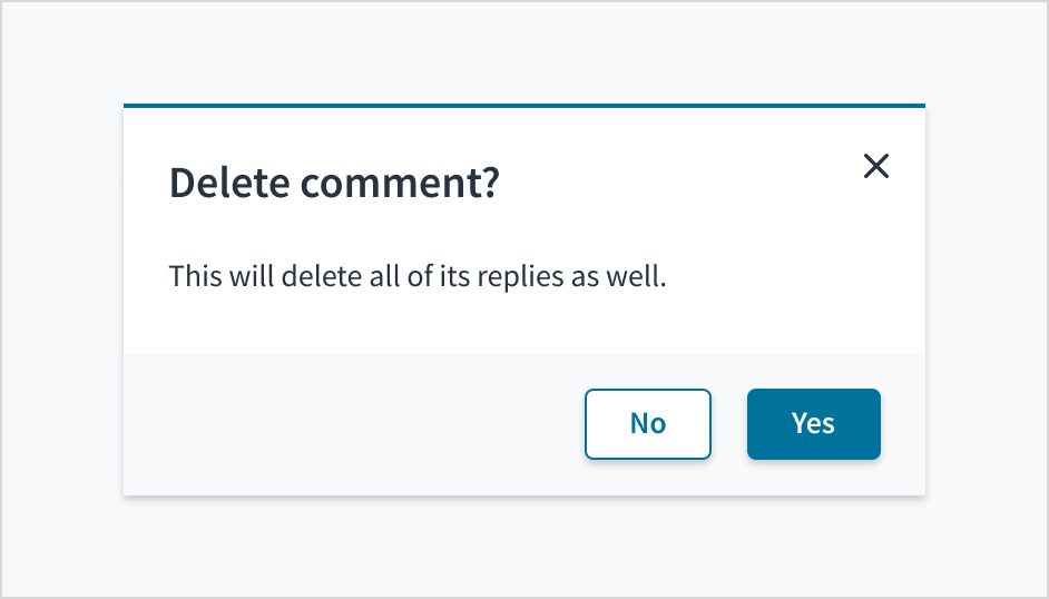 - Choose words that logically align with the preceding content: If your headline asks Delete ## object type? then your button text must also say Delete.