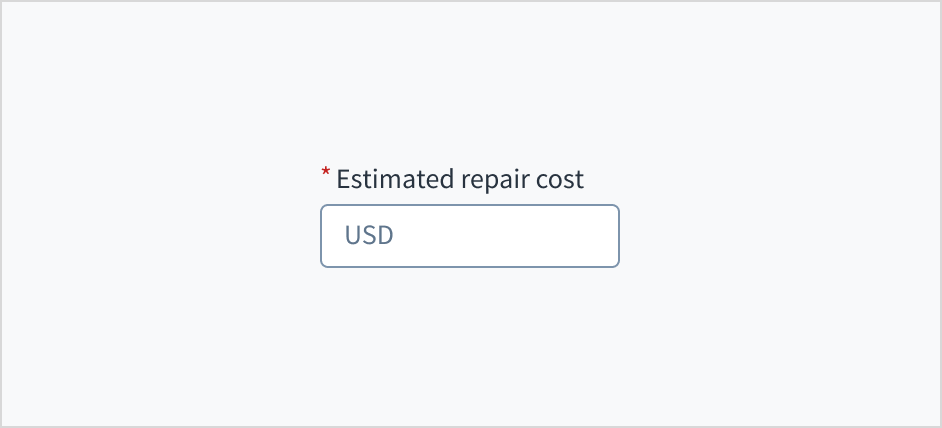 Error message text tells a user how to fix the error. For currency input fields, errors are often related to validation issues that must be fixed. For example, in a claims submission process where a user doesn't fill out a required field for estimated repair cost, you could use error text like "Enter the estimated cost of repairs."