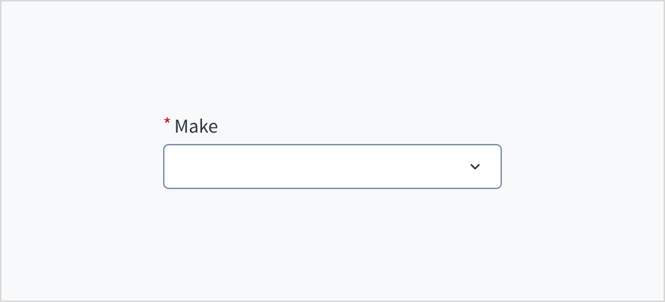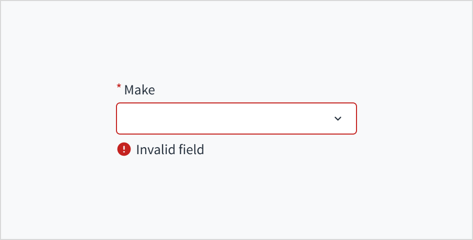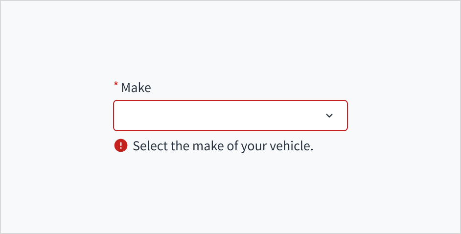 Error message text tells a user how to fix the error. In the case of the dropdown, errors are often related to something that must be fixed for in-line validation. For example, if someone doesn't input the make of their vehicle and this is a required field, you can use error text to guide the user to a solution: “Select the make of your vehicle.”