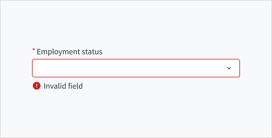 Error message text tells a user how to fix the error. In the case of the dropdown, errors are often related to something that must be fixed for in-line validation. For example, if someone doesn't select an employment status and this is a required field, you can use error text to guide the user to a solution: “Select an employment status.”