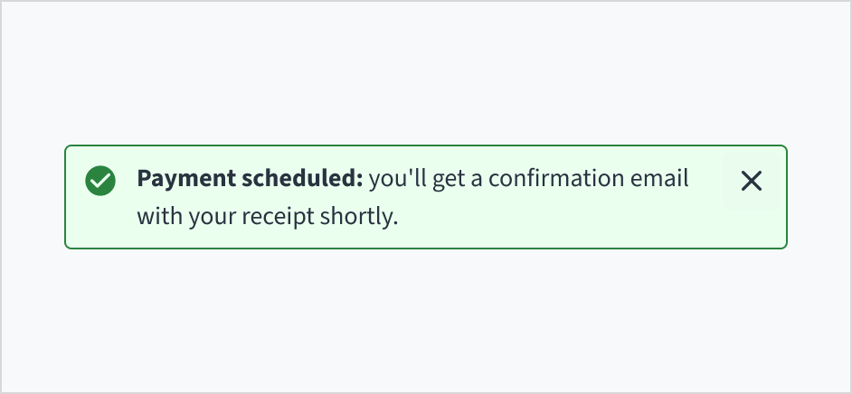 Success messages inform users that a task or action has been completed successfully. For frequent and simple actions, such as uploading a file or saving a document, keep the success message short and practical. You can use a celebratory tone for significant achievements and messages that are more infrequent in nature.