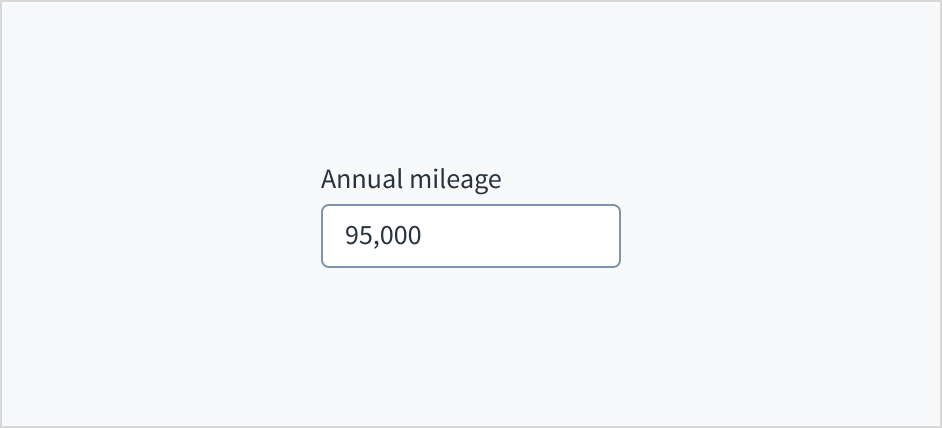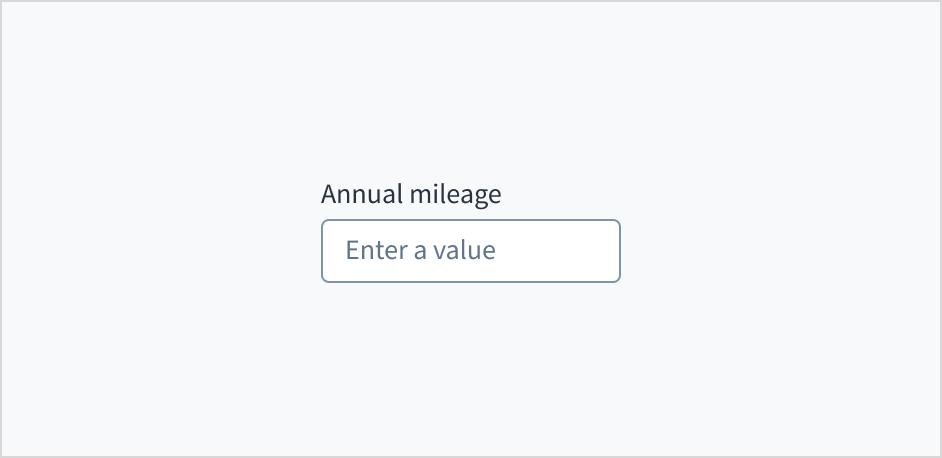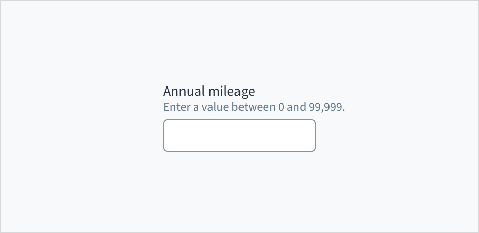 Error message text tells a user how to fix the error. In the case of the number input field, errors are often related to something that must be fixed for in-line validation. For example, if the user doesn't fill out a required field that asks for their estimated annual mileage, you can use error text to guide them to a solution: “Enter your estimated annual mileage.”