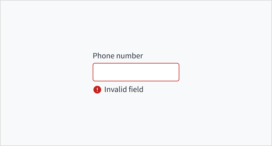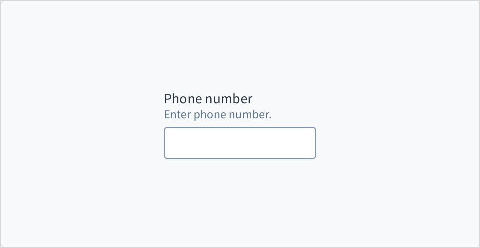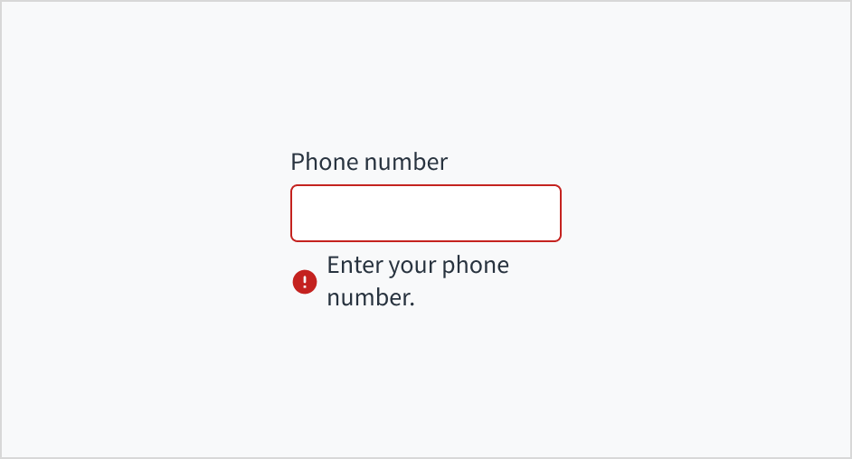 Error message text tells a user how to fix the error. In the case of the phone input field, errors are often related to something that must be fixed for in-line validation. For example, if the user doesn't fill out a required field that asks for their phone number, you can use error text to guide them to a solution: "Enter your phone number."