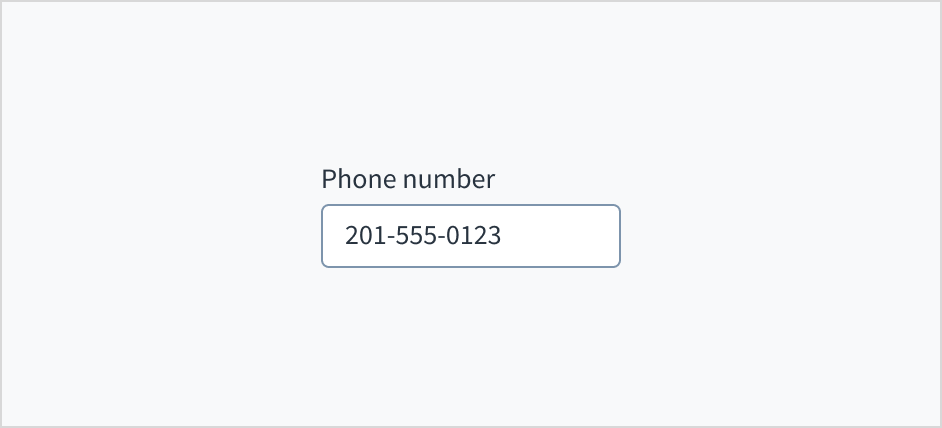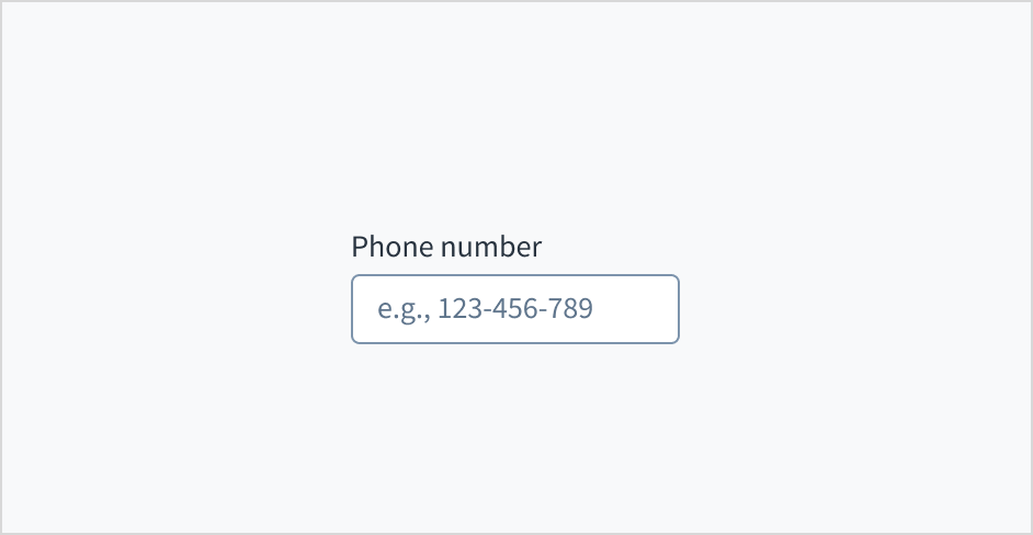 Don't put placeholder text in the phone entry field. Placeholder text strains users' short-term memory because it disappears once a value is entered. It also poses additional burdens for users with visual and cognitive impairments.