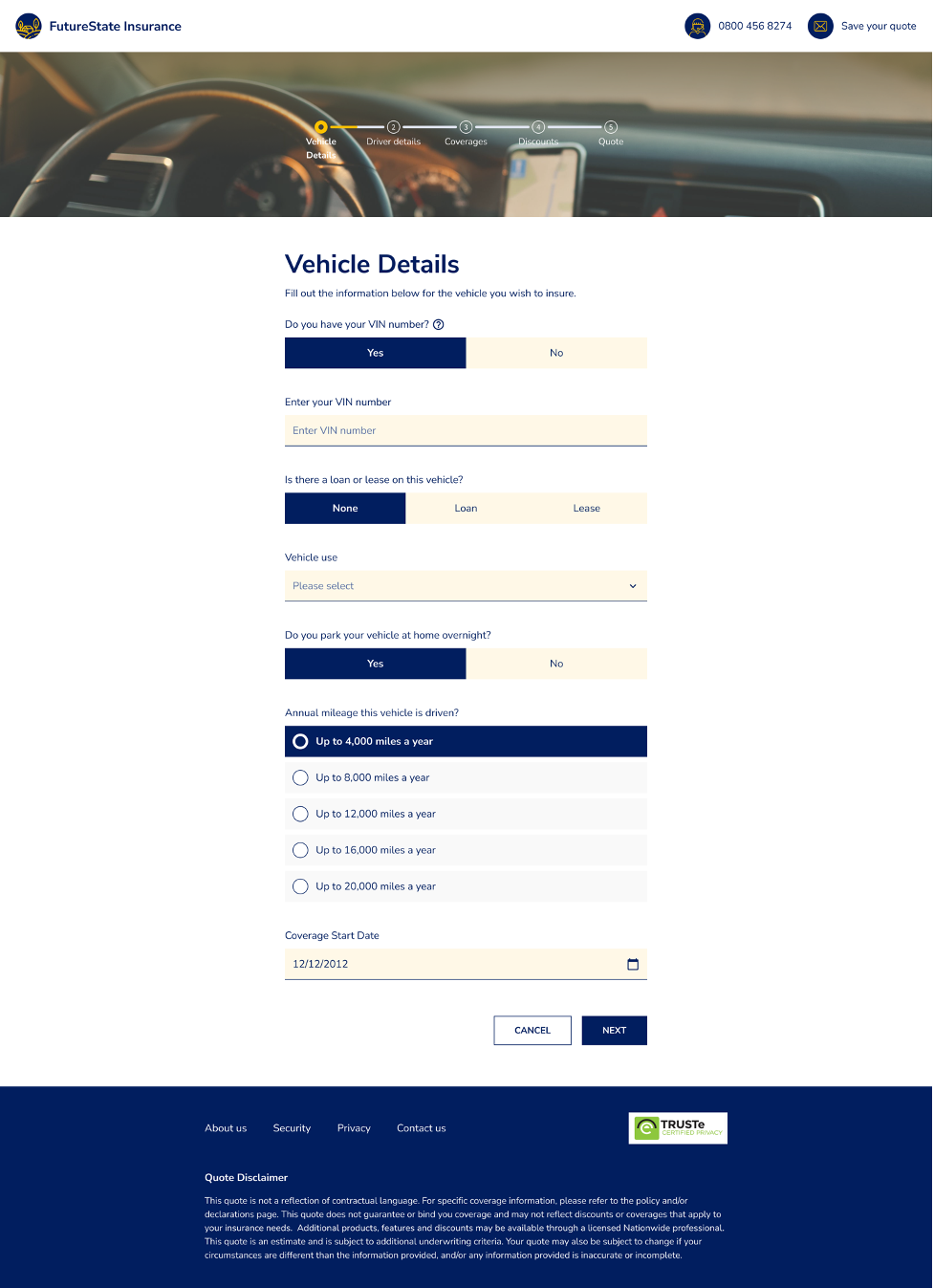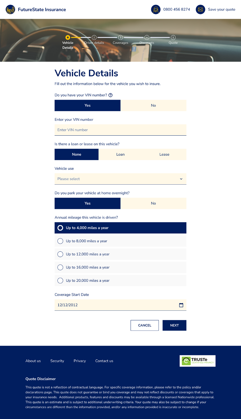We use our made-up company called “FutureState” for various workflows to see how to best optimize and test Jutro. This workflow is for usage-based insurance. You’ll see that all three form factors have the same information.