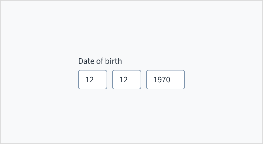 The date input combines three distinct input fields - day, month, and year - into a single date component. Users enter dates unrelated to the current date, such as birth dates, using this component.
