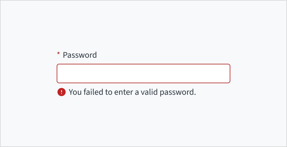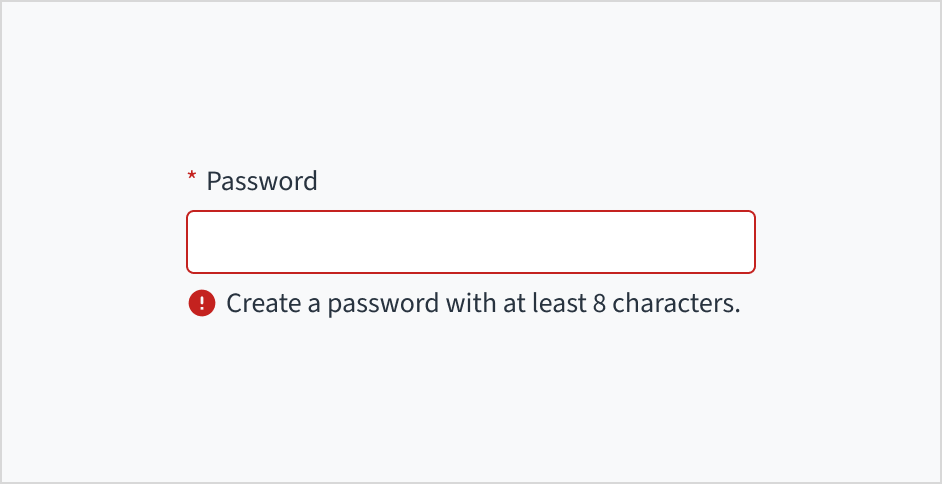 Error message text tells a user how to fix the error. In the case of the text input field, errors are often related to something that must be fixed for in-line validation. For example, if the user doesn't fill out a required field that asks for their email address, you can use error text to guide them to a solution: “Enter your email address.”