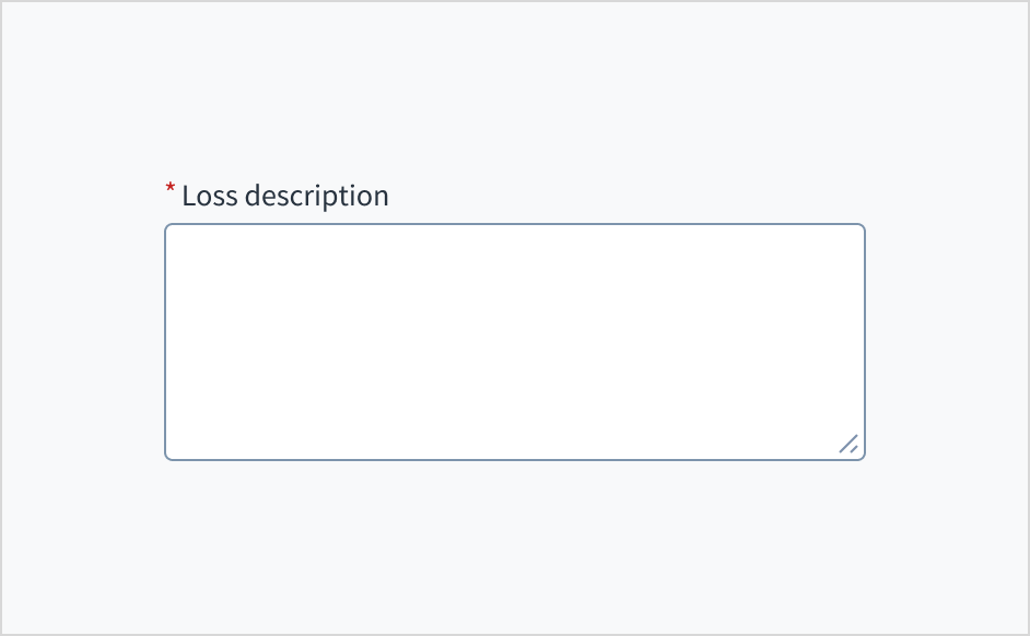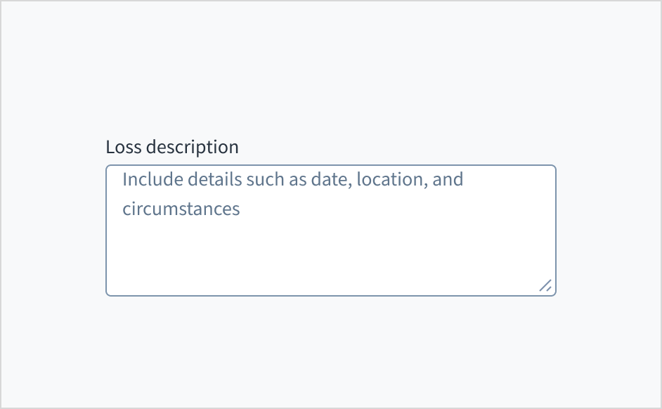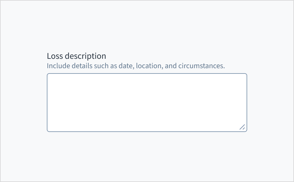 Error message text tells a user how to fix the error. In the case of the text area field, errors are often related to something that must be fixed for in-line validation. For example, if the user doesn't fill out a required field that asks for a description of their loss, you can use error text to guide them to a solution: “Enter a description of the loss.”