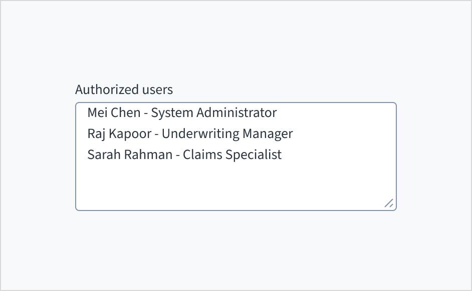 Users can manipulate the width and height of the text area using the resize handle in the bottom right of the field. If the content exceeds the visible space, a vertical scroll is enabled.