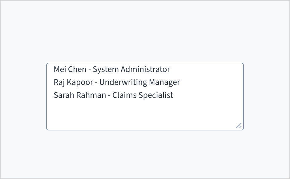 Text area is an input field that enables users to enter long-form text that spans multiple lines. Common use cases include entering detailed descriptions within forms and providing user comments.